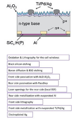 圖1.N型黑硅太陽能電池結(jié)構(gòu)示意圖和電池制作工藝主要步驟
