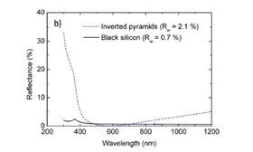 黑硅表面有納米級小山峰,反射率很低。通過優(yōu)化反應(yīng)離子刻蝕(RIE)工藝的參數(shù)來制作黑硅,由于其在很寬的波段范圍內(nèi)反射率都很低且接受角廣而備受關(guān)注。除了RIE還有其他制作黑硅的方法,如激光制絨、金屬催化濕化學(xué)刻蝕、等離子體浸沒離子注入等。黑硅在太陽能電池應(yīng)用中的一個(gè)難題是黑硅表面面積增大而導(dǎo)致表面復(fù)合速率增大,進(jìn)而造成短波段的光譜響應(yīng)變差。黑硅已經(jīng)被廣泛應(yīng)用到P型電池上,通過熱氧化和沉積SiNx作為正面鈍化層。但是低反射率的增益無法彌補(bǔ)高表面復(fù)合速率的影響,電池效率較低,效率最高可達(dá)到18.2%。